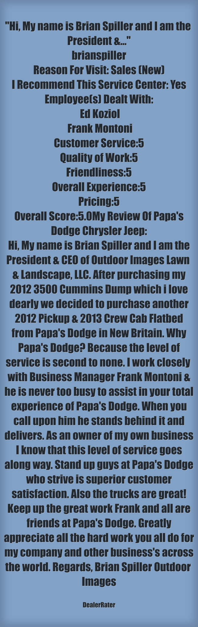 ""Hi, My name is Brian Spiller and I am the President &..." brianspiller Reason For Visit: Sales (New) I Recommend This Service Center: Yes Employee(s) Dealt With: Ed Koziol Frank Montoni Customer Service:5 Quality of Work:5 Friendliness:5 Overall Experience:5 Pricing:5 Overall Score:5.0My Review Of Papa's Dodge Chrysler Jeep: Hi, My name is Brian Spiller and I am the President & CEO of Outdoor Images Lawn & Landscape, LLC. After purchasing my 2012 3500 Cummins Dump which i love dearly we decided to purchase another 2012 Pickup & 2013 Crew Cab Flatbed from Papa's Dodge in New Britain. Why Papa's Dodge? Because the level of service is second to none. I work closely with Business Manager Frank Montoni & he is never too busy to assist in your total experience of Papa's Dodge. When you call upon him he stands behind it and delivers. As an owner of my own business I know that this level of service goes along way. Stand up guys at Papa's Dodge who strive is superior customer satisfaction. Also the trucks are great! Keep up the great work Frank and all are friends at Papa's Dodge. Greatly appreciate all the hard work you all do for my company and other business's across the world. Regards, Brian Spiller Outdoor Images"