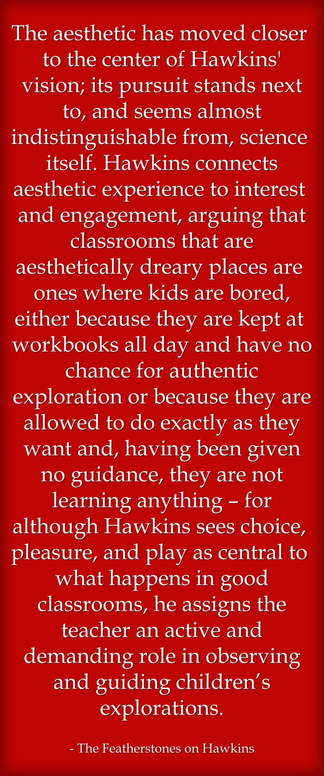 " The aesthetic has moved closer to the center of Hawkins' vision; its pursuit stands next to, and seems almost indistinguishable from, science itself. Hawkins connects aesthetic experience to interest and engagement, arguing that classrooms that are aesthetically dreary places are ones where kids are bored, either because they are kept at workbooks all day and have no chance for authentic exploration or because they are allowed to do exactly as they want and, having been given no guidance, they are not learning anything – for although Hawkins sees choice, pleasure, and play as central to what happens in good classrooms, he assigns the teacher an active and demanding role in observing and guiding children’s explorations. "