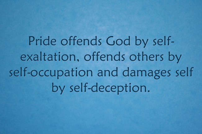 "Pride offends God by self-exaltation, offends others by self-occupation and damages self by self-deception."