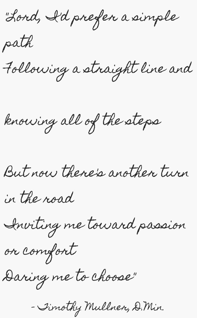 ""Lord, I'd prefer a simple path Following a straight line and knowing all of the steps But now there's another turn in the road Inviting me toward passion or comfort Daring me to choose""