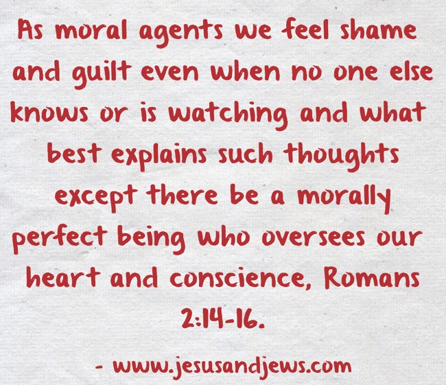 "As moral agents we feel shame and guilt even when no one else knows or is watching and what best explains such thoughts except there be a morally perfect being who oversees our heart and conscience, Romans 2:14-16."