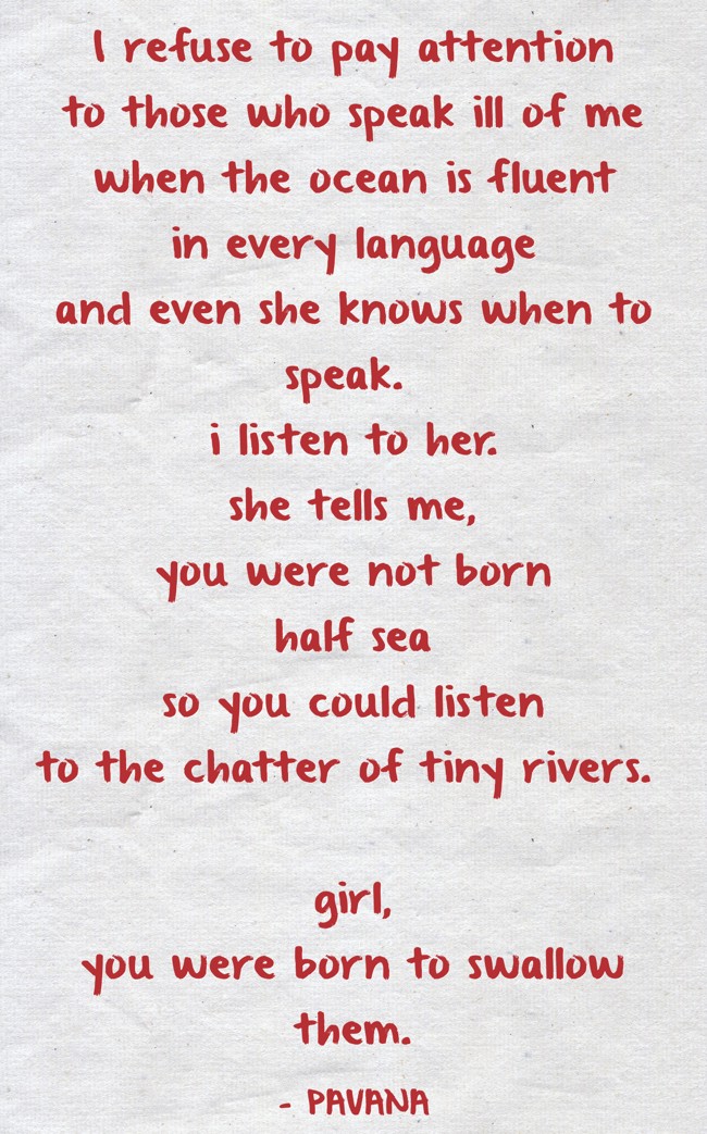 "I refuse to pay attention to those who speak ill of me when the ocean is fluent in every language and even she knows when to speak. i listen to her. she tells me, you were not born half sea so you could listen to the chatter of tiny rivers. girl, you were born to swallow them."
