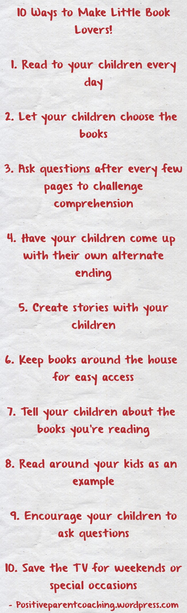"10 Ways to Make Little Book Lovers! 1. Read to your children every day 2. Let your children choose the books 3. Ask questions after every few pages to challenge comprehension 4. Have your children come up with their own alternate ending 5. Create stories with your children 6. Keep books around the house for easy access 7. Tell your children about the books you’re reading 8. Read around your kids as an example 9. Encourage your children to ask questions 10. Save the TV for weekends or special occasions"