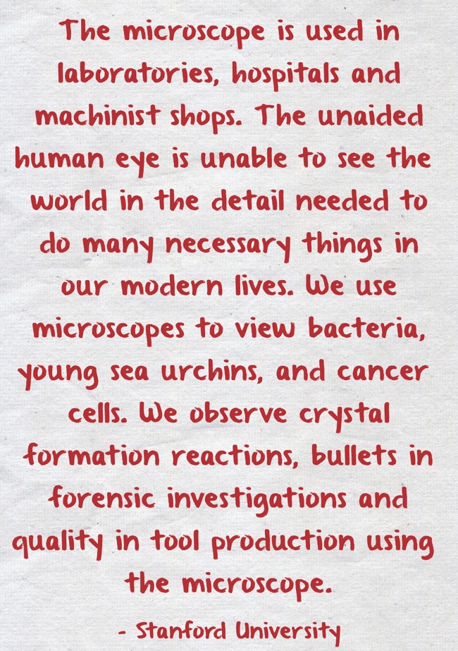 "The microscope is used in laboratories, hospitals and machinist shops. The unaided human eye is unable to see the world in the detail needed to do many necessary things in our modern lives. We use microscopes to view bacteria, young sea urchins, and cancer cells. We observe crystal formation reactions, bullets in forensic investigations and quality in tool production using the microscope."
