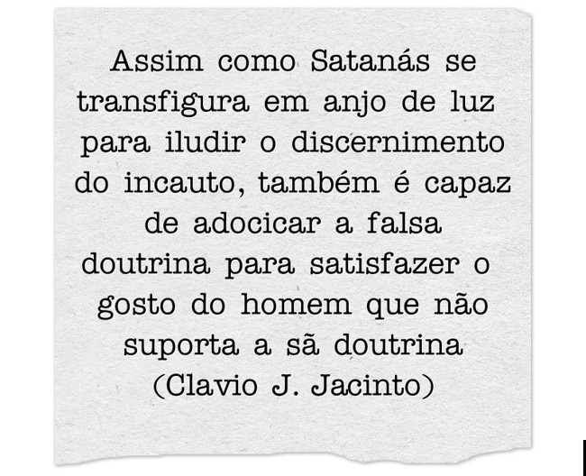 "Assim como Satanás se transfigura em anjo de luz para iludir o discernimento do incauto, também é capaz de adocicar a falsa doutrina para satisfazer o gosto do homem que não suporta a sã doutrina (Clavio J. Jacinto)"