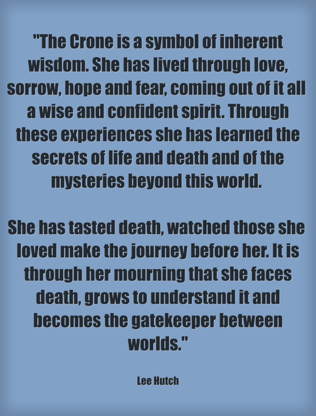 ""The Crone is a symbol of inherent wisdom. She has lived through love, sorrow, hope and fear, coming out of it all a wise and confident spirit. Through these experiences she has learned the secrets of life and death and of the mysteries beyond this world. She has tasted death, watched those she loved make the journey before her. It is through her mourning that she faces death, grows to understand it and becomes the gatekeeper between worlds.""