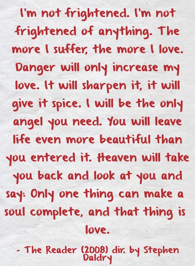 "I’m not frightened. I’m not frightened of anything. The more I suffer, the more I love. Danger will only increase my love. It will sharpen it, it will give it spice. I will be the only angel you need. You will leave life even more beautiful than you entered it. Heaven will take you back and look at you and say: Only one thing can make a soul complete, and that thing is love."