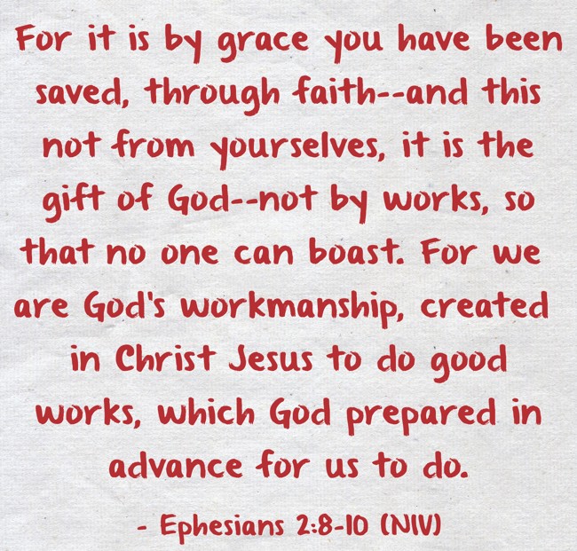 "For it is by grace you have been saved, through faith--and this not from yourselves, it is the gift of God--not by works, so that no one can boast. For we are God's workmanship, created in Christ Jesus to do good works, which God prepared in advance for us to do."