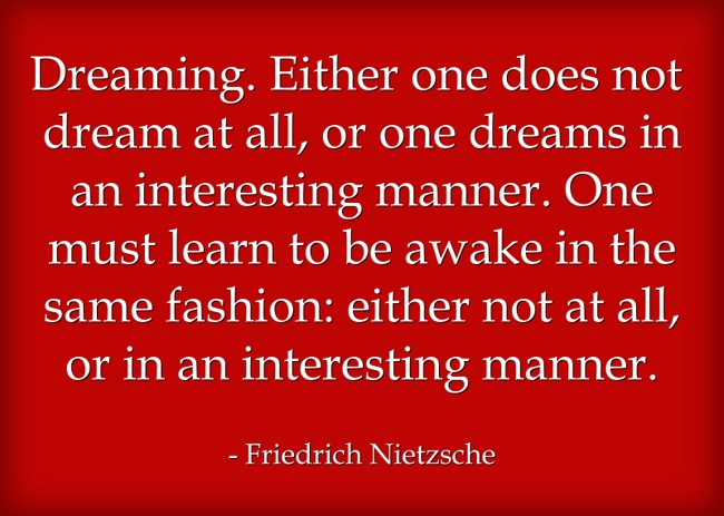"Dreaming. Either one does not dream at all, or one dreams in an interesting manner. One must learn to be awake in the same fashion: either not at all, or in an interesting manner. "