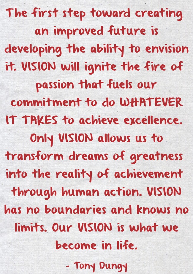 "The first step toward creating an improved future is developing the ability to envision it. VISION will ignite the fire of passion that fuels our commitment to do WHATEVER IT TAKES to achieve excellence. Only VISION allows us to transform dreams of greatness into the reality of achievement through human action. VISION has no boundaries and knows no limits. Our VISION is what we become in life."