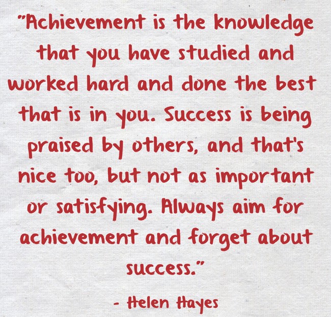""Achievement is the knowledge that you have studied and worked hard and done the best that is in you. Success is being praised by others, and that's nice too, but not as important or satisfying. Always aim for achievement and forget about success.""