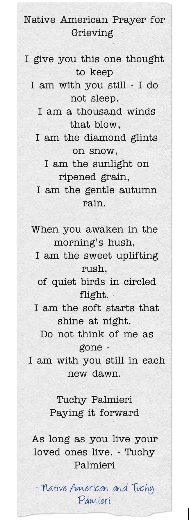 "Native American Prayer for Grieving I give you this one thought to keep I am with you still - I do not sleep. I am a thousand winds that blow, I am the diamond glints on snow, I am the sunlight on ripened grain, I am the gentle autumn rain. When you awaken in the morning's hush, I am the sweet uplifting rush, of quiet birds in circled flight. I am the soft starts that shine at night. Do not think of me as gone - I am with you still in each new dawn. Tuchy Palmieri Paying it forward As long as you live your loved ones live. - Tuchy Palmieri"