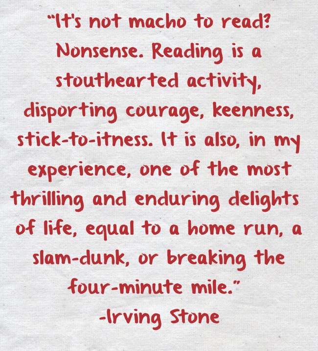 "“It's not macho to read? Nonsense. Reading is a stouthearted activity, disporting courage, keenness, stick-to-itness. It is also, in my experience, one of the most thrilling and enduring delights of life, equal to a home run, a slam-dunk, or breaking the four-minute mile.” -Irving Stone"