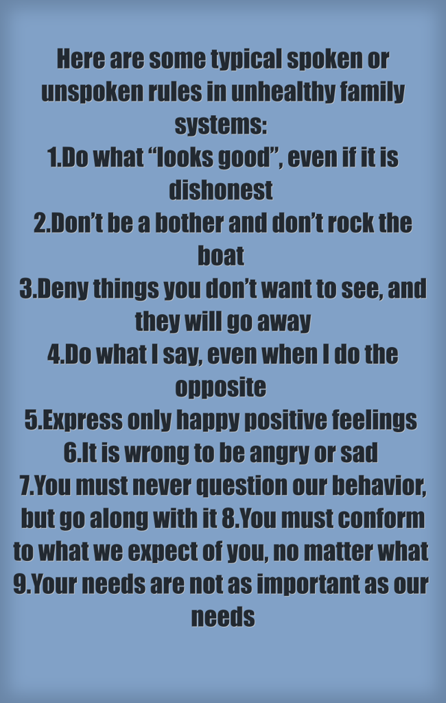 "Here are some typical spoken or unspoken rules in unhealthy family systems: 1.Do what “looks good”, even if it is dishonest 2.Don’t be a bother and don’t rock the boat 3.Deny things you don’t want to see, and they will go away 4.Do what I say, even when I do the opposite 5.Express only happy positive feelings 6.It is wrong to be angry or sad 7.You must never question our behavior, but go along with it 8.You must conform to what we expect of you, no matter what 9.Your needs are not as important as our needs "