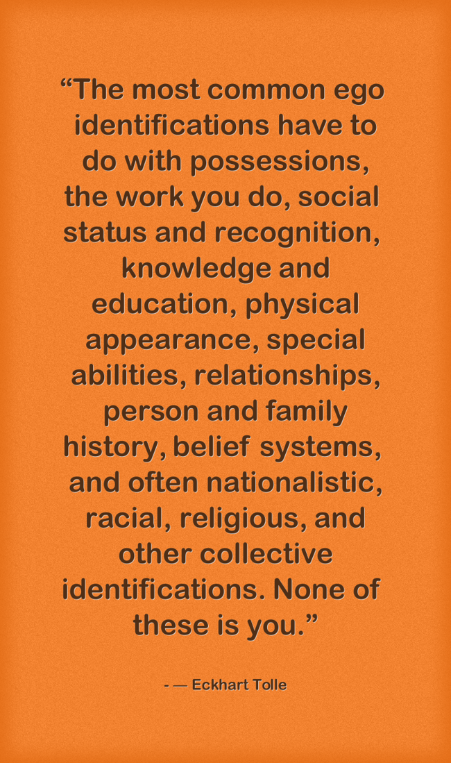 "“The most common ego identifications have to do with possessions, the work you do, social status and recognition, knowledge and education, physical appearance, special abilities, relationships, person and family history, belief systems, and often nationalistic, racial, religious, and other collective identifications. None of these is you.” "