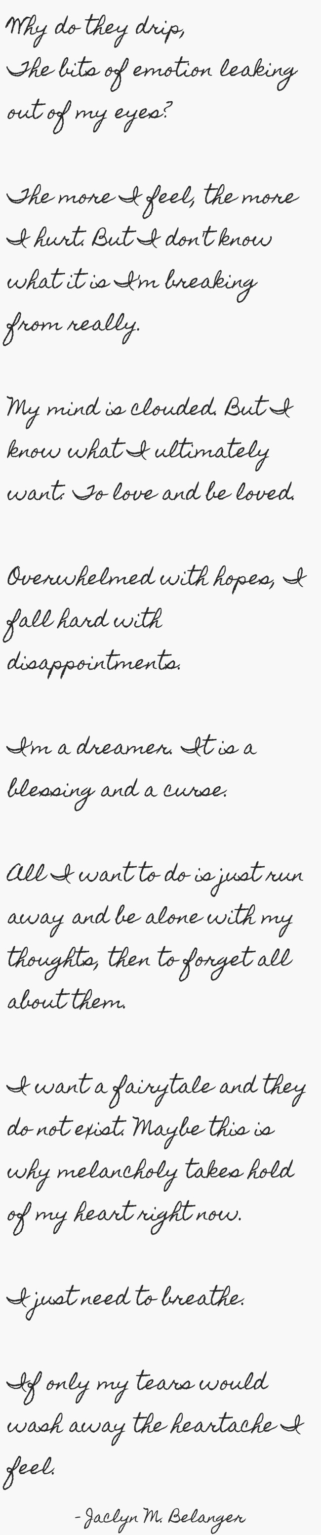 "Why do they drip, The bits of emotion leaking out of my eyes? The more I feel, the more I hurt. But I don't know what it is I'm breaking from really. My mind is clouded. But I know what I ultimately want: To love and be loved. Overwhelmed with hopes, I fall hard with disappointments. I'm a dreamer. It is a blessing and a curse. All I want to do is just run away and be alone with my thoughts, then to forget all about them. I want a fairytale and they do not exist. Maybe this is why melancholy takes hold of my heart right now. I just need to breathe. If only my tears would wash away the heartache I feel. "