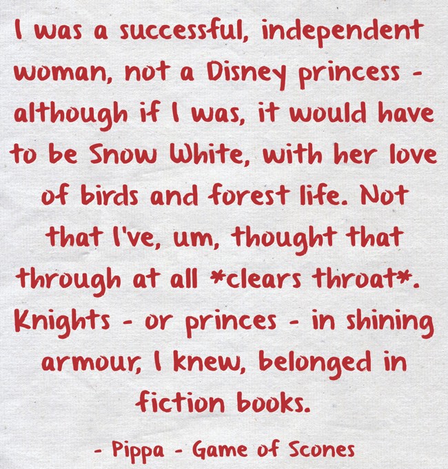 "I was a successful, independent woman, not a Disney princess – although if I was, it would have to be Snow White, with her love of birds and forest life. Not that I’ve, um, thought that through at all *clears throat*. Knights – or princes – in shining armour, I knew, belonged in fiction books."