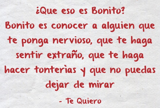 "¿Que eso es Bonito? Bonito es conocer a alguien que te ponga nervioso, que te haga sentir extraño, que te haga hacer tonterìas y que no puedas dejar de mirar"