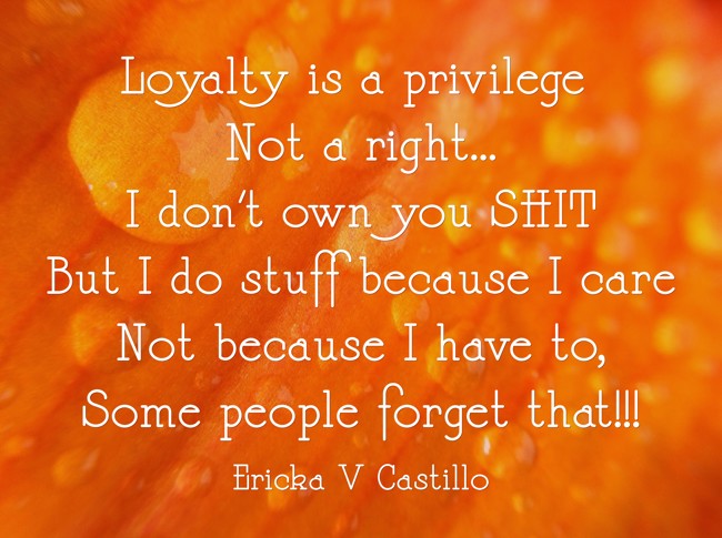 "Loyalty is a privilege Not a right... I don't own you SHIT But I do stuff because I care Not because I have to, Some people forget that!!!"
