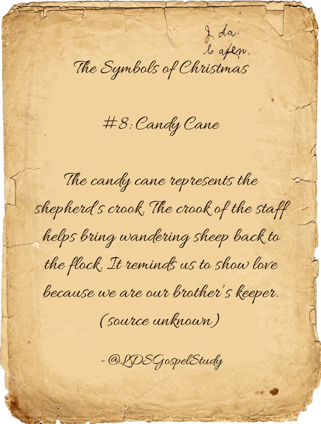 "The Symbols of Christmas #8: Candy Cane The candy cane represents the shepherd’s crook. The crook of the staff helps bring wandering sheep back to the flock. It reminds us to show love because we are our brother’s keeper. (source unknown) "