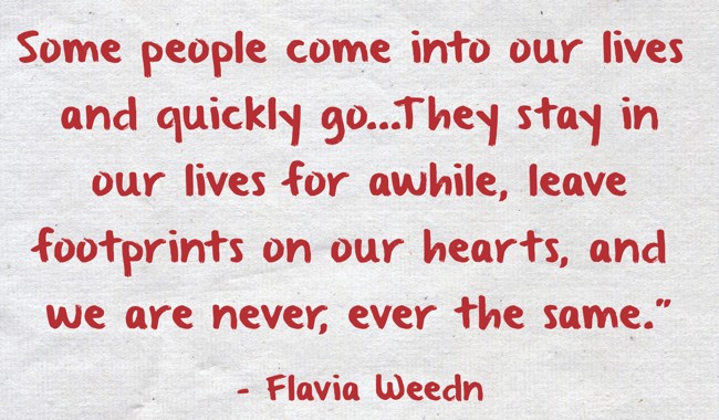 "Some people come into our lives and quickly go...They stay in our lives for awhile, leave footprints on our hearts, and we are never, ever the same.”"