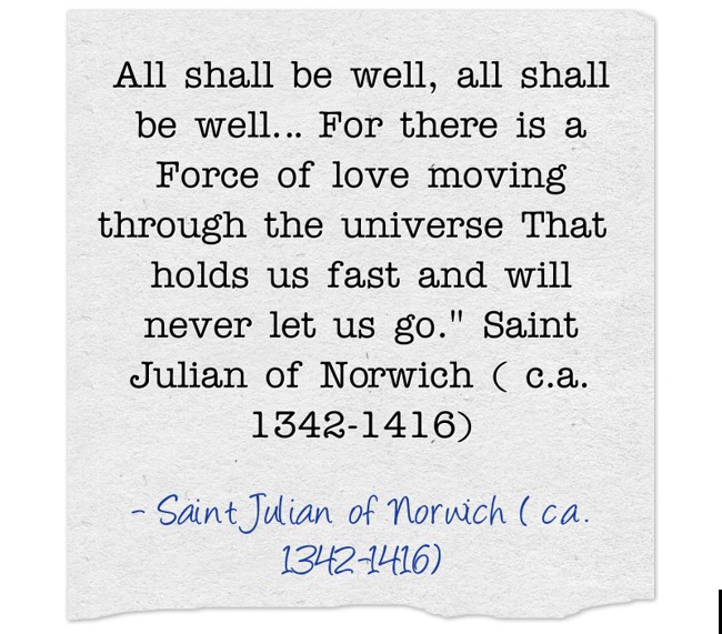 "All shall be well, all shall be well... For there is a Force of love moving through the universe That holds us fast and will never let us go." Saint Julian of Norwich ( c.a. 1342-1416)"