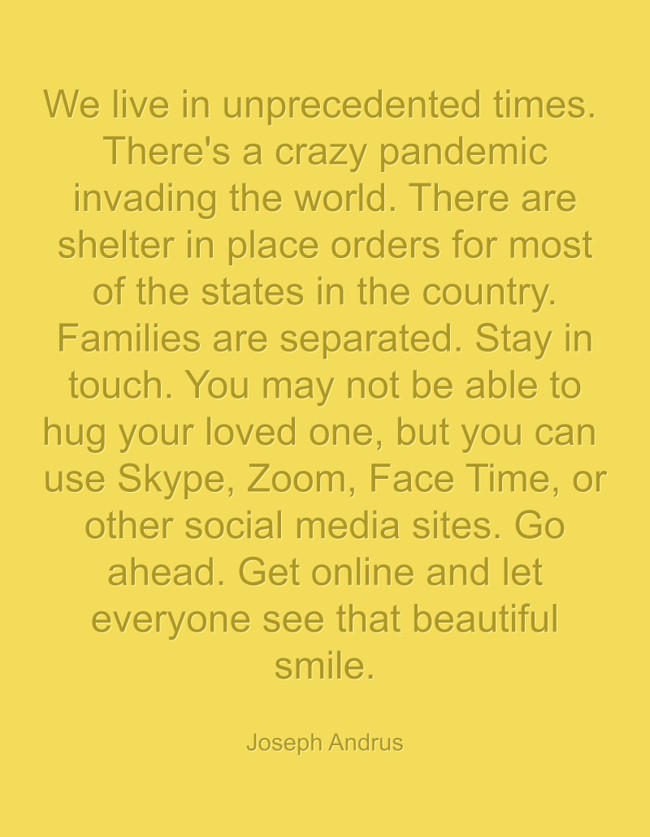 "We live in unprecedented times. There's a crazy pandemic invading the world. There are shelter in place orders for most of the states in the country. Families are separated. Stay in touch. You may not be able to hug your loved one, but you can use Skype, Zoom, Face Time, or other social media sites. Go ahead. Get online and let everyone see that beautiful smile."