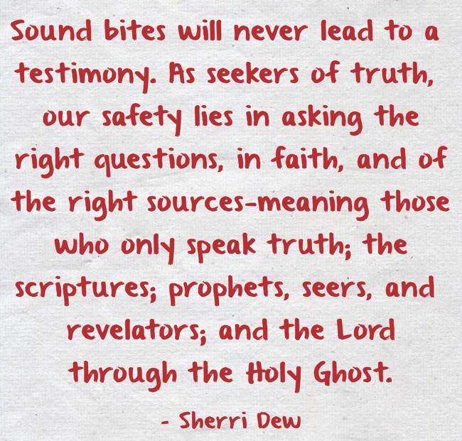 "Sound bites will never lead to a testimony. As seekers of truth, our safety lies in asking the right questions, in faith, and of the right sources—meaning those who only speak truth; the scriptures; prophets, seers, and revelators; and the Lord through the Holy Ghost."