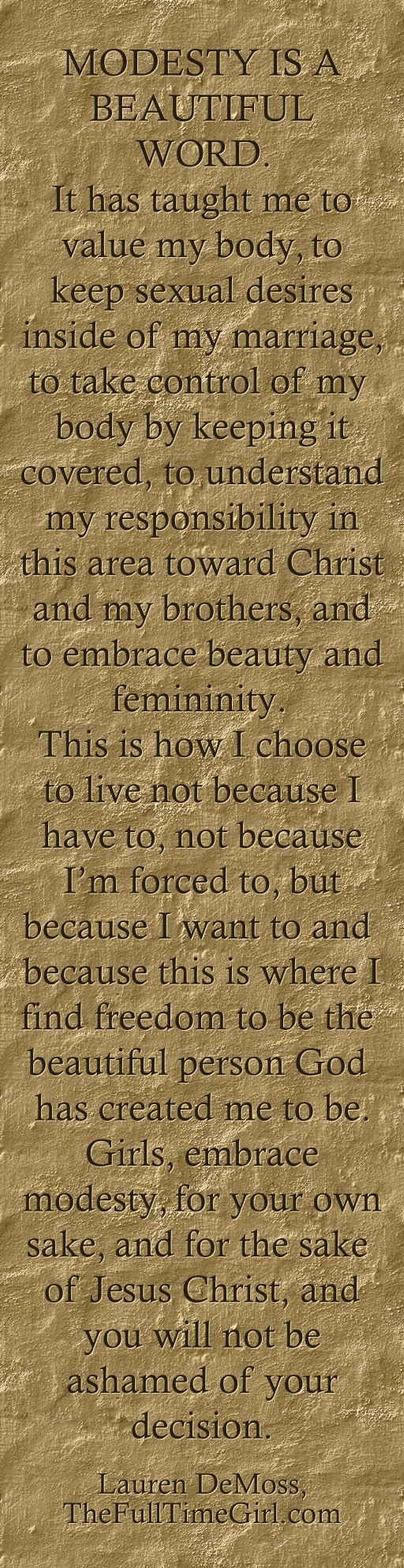 "MODESTY IS A BEAUTIFUL WORD. It has taught me to value my body, to keep sexual desires inside of my marriage, to take control of my body by keeping it covered, to understand my responsibility in this area toward Christ and my brothers, and to embrace beauty and femininity. This is how I choose to live not because I have to, not because I’m forced to, but because I want to and because this is where I find freedom to be the beautiful person God has created me to be. Girls, embrace modesty, for your own sake, and for the sake of Jesus Christ, and you will not be ashamed of your decision."