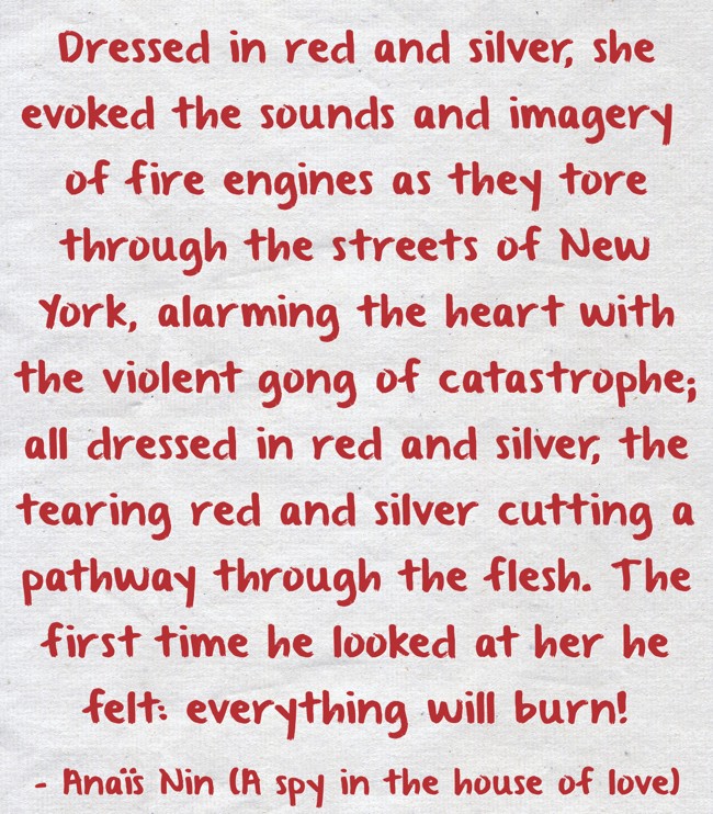 "Dressed in red and silver, she evoked the sounds and imagery of fire engines as they tore through the streets of New York, alarming the heart with the violent gong of catastrophe; all dressed in red and silver, the tearing red and silver cutting a pathway through the flesh. The first time he looked at her he felt: everything will burn!"