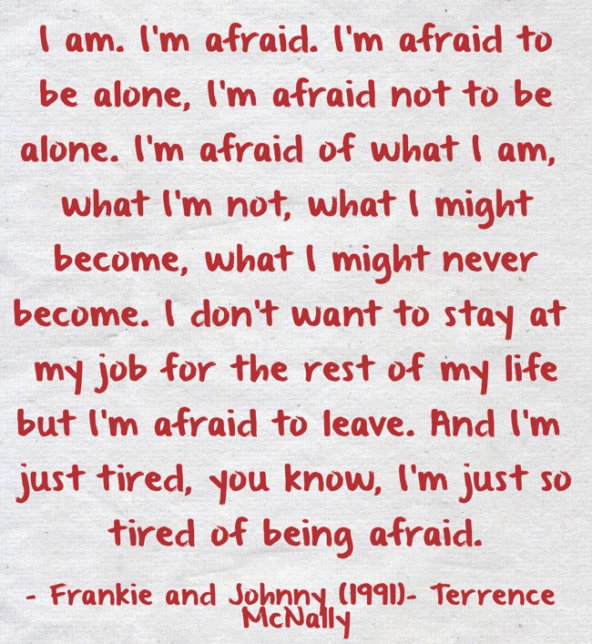"I am. I’m afraid. I’m afraid to be alone, I’m afraid not to be alone. I’m afraid of what I am, what I’m not, what I might become, what I might never become. I don’t want to stay at my job for the rest of my life but I’m afraid to leave. And I’m just tired, you know, I’m just so tired of being afraid."