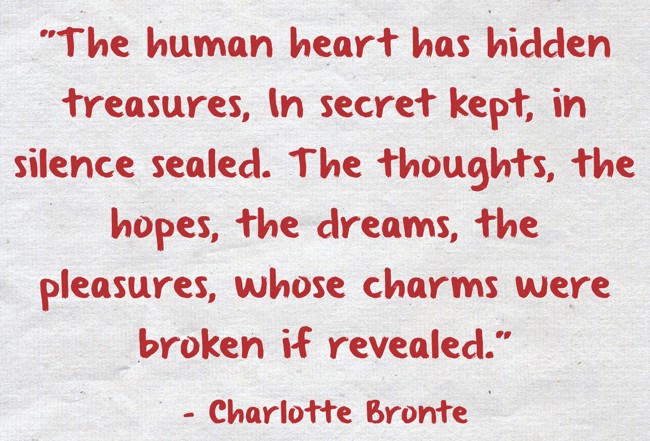 ""The human heart has hidden treasures, In secret kept, in silence sealed. The thoughts, the hopes, the dreams, the pleasures, whose charms were broken if revealed.""