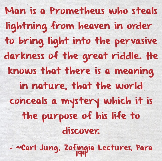 "Man is a Prometheus who steals lightning from heaven in order to bring light into the pervasive darkness of the great riddle. He knows that there is a meaning in nature, that the world conceals a mystery which it is the purpose of his life to discover. "