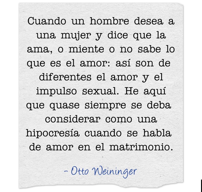"Cuando un hombre desea a una mujer y dice que la ama, o miente o no sabe lo que es el amor: así son de diferentes el amor y el impulso sexual. He aquí que quase siempre se deba considerar como una hipocresía cuando se habla de amor en el matrimonio."