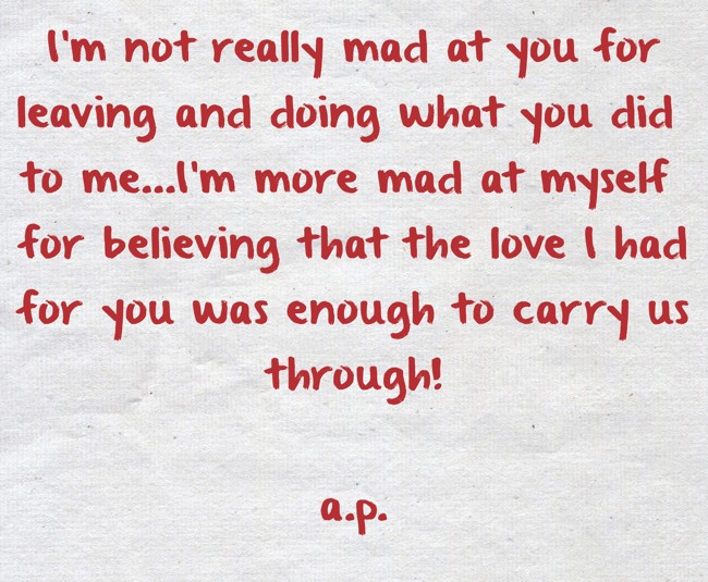 "I'm not really mad at you for leaving and doing what you did to me…I'm more mad at myself for believing that the love I had for you was enough to carry us through! a.p."