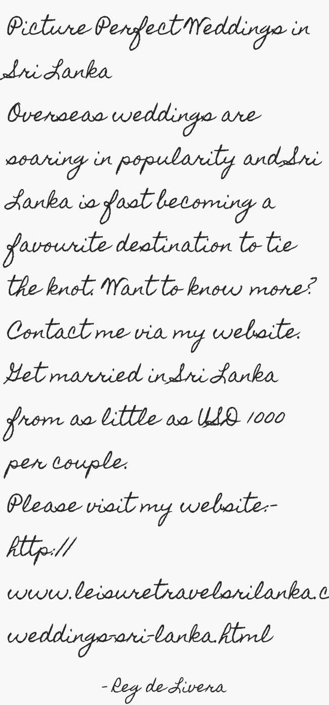"Picture Perfect Weddings in Sri Lanka Overseas weddings are soaring in popularity and Sri Lanka is fast becoming a favourite destination to tie the knot. Want to know more? Contact me via my website. Get married in Sri Lanka from as little as USD 1000 per couple. Please visit my website:-http://www.leisuretravelsrilanka.com/weddings-sri-lanka.html"
