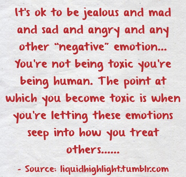 " It’s ok to be jealous and mad and sad and angry and any other “negative” emotion… You’re not being toxic you’re being human. The point at which you become toxic is when you’re letting these emotions seep into how you treat others...... "