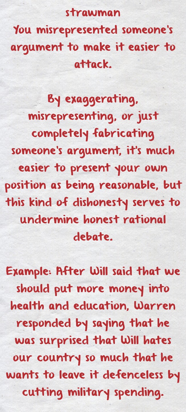 "strawman You misrepresented someone's argument to make it easier to attack. By exaggerating, misrepresenting, or just completely fabricating someone's argument, it's much easier to present your own position as being reasonable, but this kind of dishonesty serves to undermine honest rational debate. Example: After Will said that we should put more money into health and education, Warren responded by saying that he was surprised that Will hates our country so much that he wants to leave it defenceless by cutting military spending. "