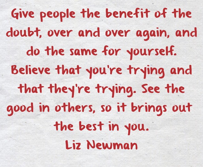 "Give people the benefit of the doubt, over and over again, and do the same for yourself. Believe that you’re trying and that they’re trying. See the good in others, so it brings out the best in you. Liz Newman"