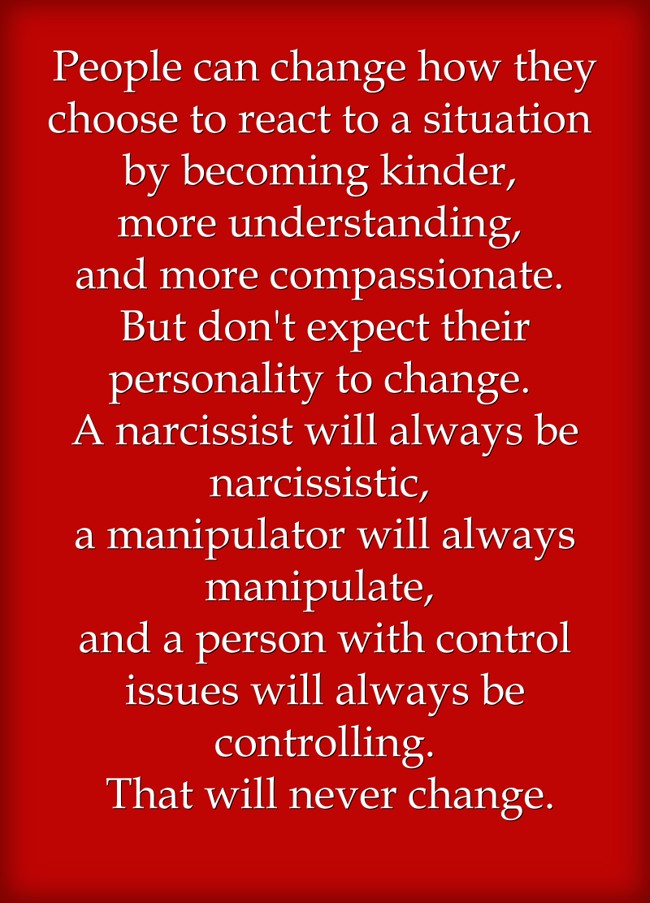 " People can change how they choose to react to a situation by becoming kinder, more understanding, and more compassionate. But don't expect their personality to change. A narcissist will always be narcissistic, a manipulator will always manipulate, and a person with control issues will always be controlling. That will never change. "