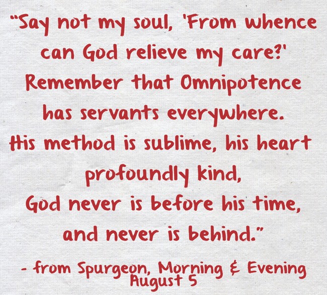 "“Say not my soul, ‘From whence can God relieve my care?’ Remember that Omnipotence has servants everywhere. His method is sublime, his heart profoundly kind, God never is before his time, and never is behind.” "