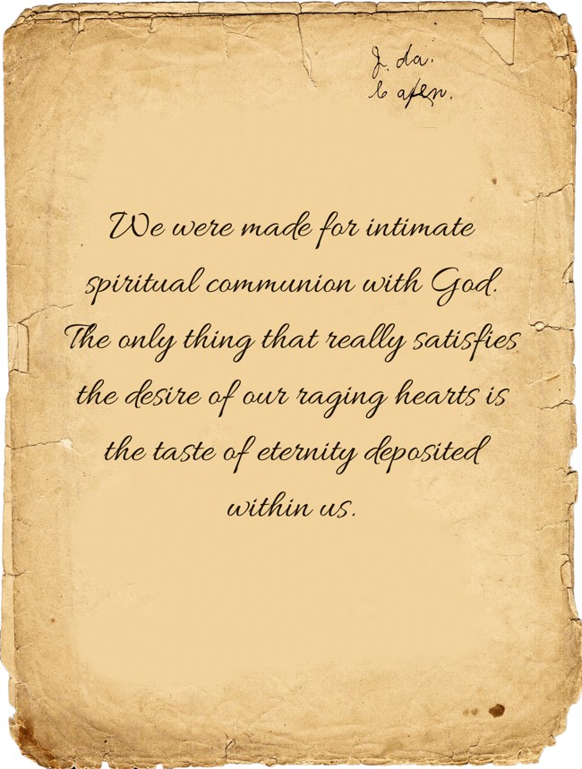 "We were made for intimate spiritual communion with God. The only thing that really satisfies the desire of our raging hearts is the taste of eternity deposited within us."