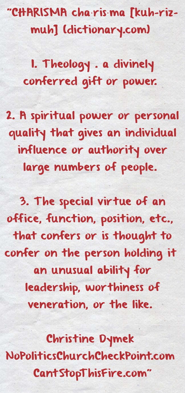 ""CHARISMA cha·ris·ma [kuh-riz-muh] (dictionary.com) 1. Theology . a divinely conferred gift or power. 2. A spiritual power or personal quality that gives an individual influence or authority over large numbers of people. 3. The special virtue of an office, function, position, etc., that confers or is thought to confer on the person holding it an unusual ability for leadership, worthiness of veneration, or the like. Christine Dymek NoPoliticsChurchCheckPoint.com CantStopThisFire.com""