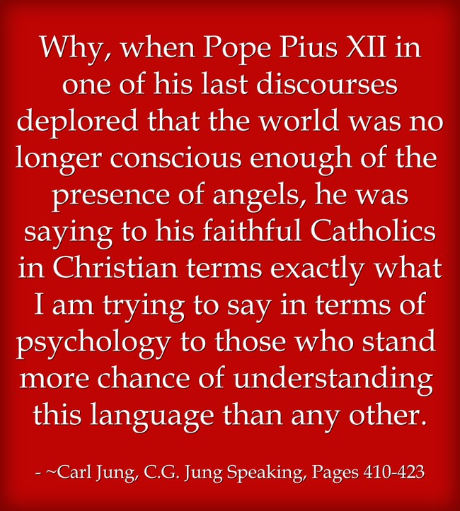 "Why, when Pope Pius XII in one of his last discourses deplored that the world was no longer conscious enough of the presence of angels, he was saying to his faithful Catholics in Christian terms exactly what I am trying to say in terms of psychology to those who stand more chance of understanding this language than any other."