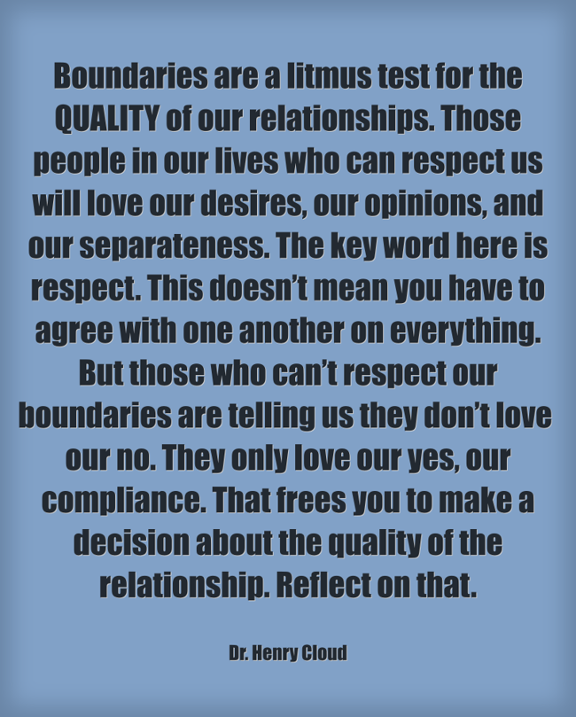 "Boundaries are a litmus test for the QUALITY of our relationships. Those people in our lives who can respect us will love our desires, our opinions, and our separateness. The key word here is respect. This doesn’t mean you have to agree with one another on everything. But those who can’t respect our boundaries are telling us they don’t love our no. They only love our yes, our compliance. That frees you to make a decision about the quality of the relationship. Reflect on that."