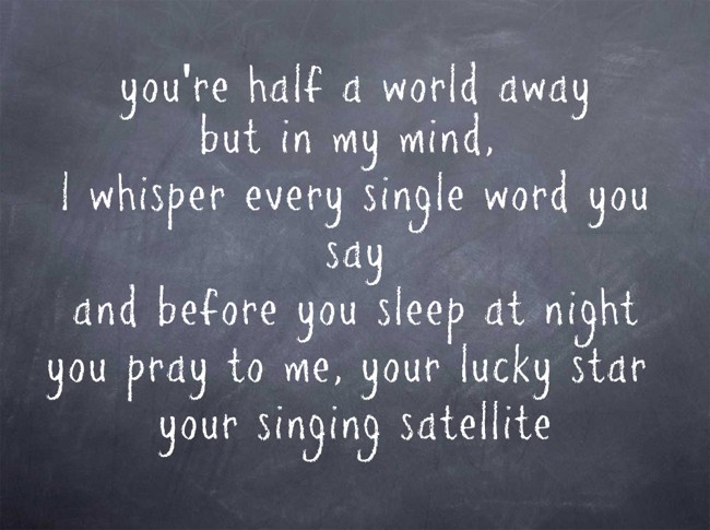 "you're half a world away but in my mind, I whisper every single word you say and before you sleep at night you pray to me, your lucky star your singing satellite"