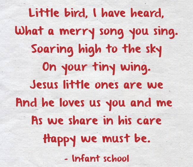 "Little bird, I have heard, What a merry song you sing. Soaring high to the sky On your tiny wing. Jesus little ones are we And he loves us you and me As we share in his care Happy we must be."