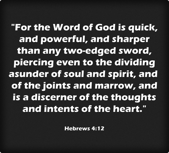 ""For the Word of God is quick, and powerful, and sharper than any two-edged sword, piercing even to the dividing asunder of soul and spirit, and of the joints and marrow, and is a discerner of the thoughts and intents of the heart.""