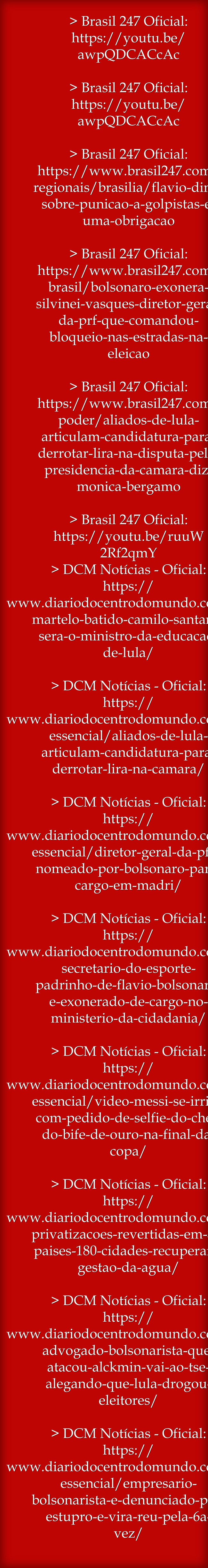 "> Brasil 247 Oficial: https://youtu.be/awpQDCACcAc > Brasil 247 Oficial: https://youtu.be/awpQDCACcAc > Brasil 247 Oficial: https://www.brasil247.com/regionais/brasilia/flavio-dino-sobre-punicao-a-golpistas-e-uma-obrigacao > Brasil 247 Oficial: https://www.brasil247.com/brasil/bolsonaro-exonera-silvinei-vasques-diretor-geral-da-prf-que-comandou-bloqueio-nas-estradas-na-eleicao > Brasil 247 Oficial: https://www.brasil247.com/poder/aliados-de-lula-articulam-candidatura-para-derrotar-lira-na-disputa-pela-presidencia-da-camara-diz-monica-bergamo > Brasil 247 Oficial: https://youtu.be/ruuW2Rf2qmY > DCM Notícias - Oficial: https://www.diariodocentrodomundo.com.br/martelo-batido-camilo-santana-sera-o-ministro-da-educacao-de-lula/ > DCM Notícias - Oficial: https://www.diariodocentrodomundo.com.br/essencial/aliados-de-lula-articulam-candidatura-para-derrotar-lira-na-camara/ > DCM Notícias - Oficial: https://www.diariodocentrodomundo.com.br/essencial/diretor-geral-da-pf-e-nomeado-por-bolsonaro-para-cargo-em-madri/ > DCM Notícias - Oficial: https://www.diariodocentrodomundo.com.br/secretario-do-esporte-padrinho-de-flavio-bolsonaro-e-exonerado-de-cargo-no-ministerio-da-cidadania/ > DCM Notícias - Oficial: https://www.diariodocentrodomundo.com.br/essencial/video-messi-se-irrita-com-pedido-de-selfie-do-chef-do-bife-de-ouro-na-final-da-copa/ > DCM Notícias - Oficial: https://www.diariodocentrodomundo.com.br/privatizacoes-revertidas-em-35-paises-180-cidades-recuperam-gestao-da-agua/ > DCM Notícias - Oficial: https://www.diariodocentrodomundo.com.br/advogado-bolsonarista-que-atacou-alckmin-vai-ao-tse-alegando-que-lula-drogou-eleitores/ > DCM Notícias - Oficial: https://www.diariodocentrodomundo.com.br/essencial/empresario-bolsonarista-e-denunciado-por-estupro-e-vira-reu-pela-6a-vez/"
