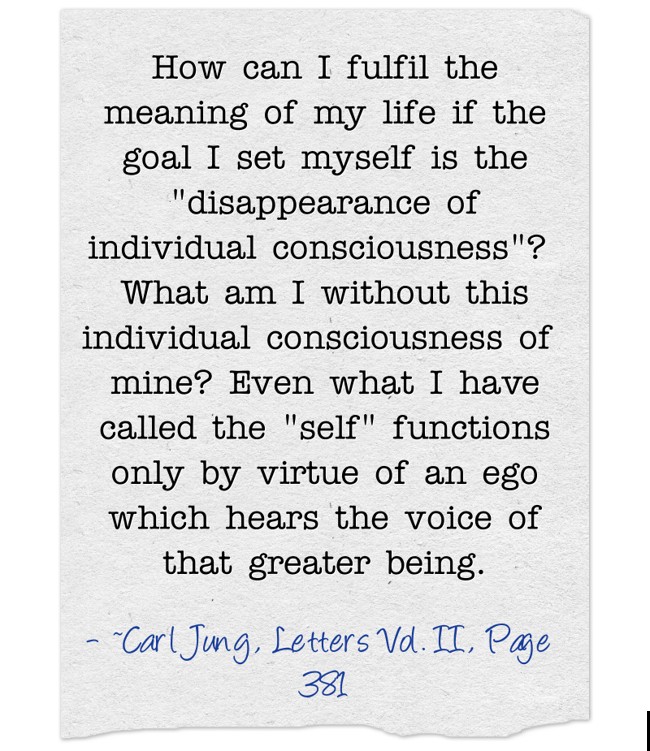 "How can I fulfil the meaning of my life if the goal I set myself is the "disappearance of individual consciousness"? What am I without this individual consciousness of mine? Even what I have called the "self" functions only by virtue of an ego which hears the voice of that greater being."